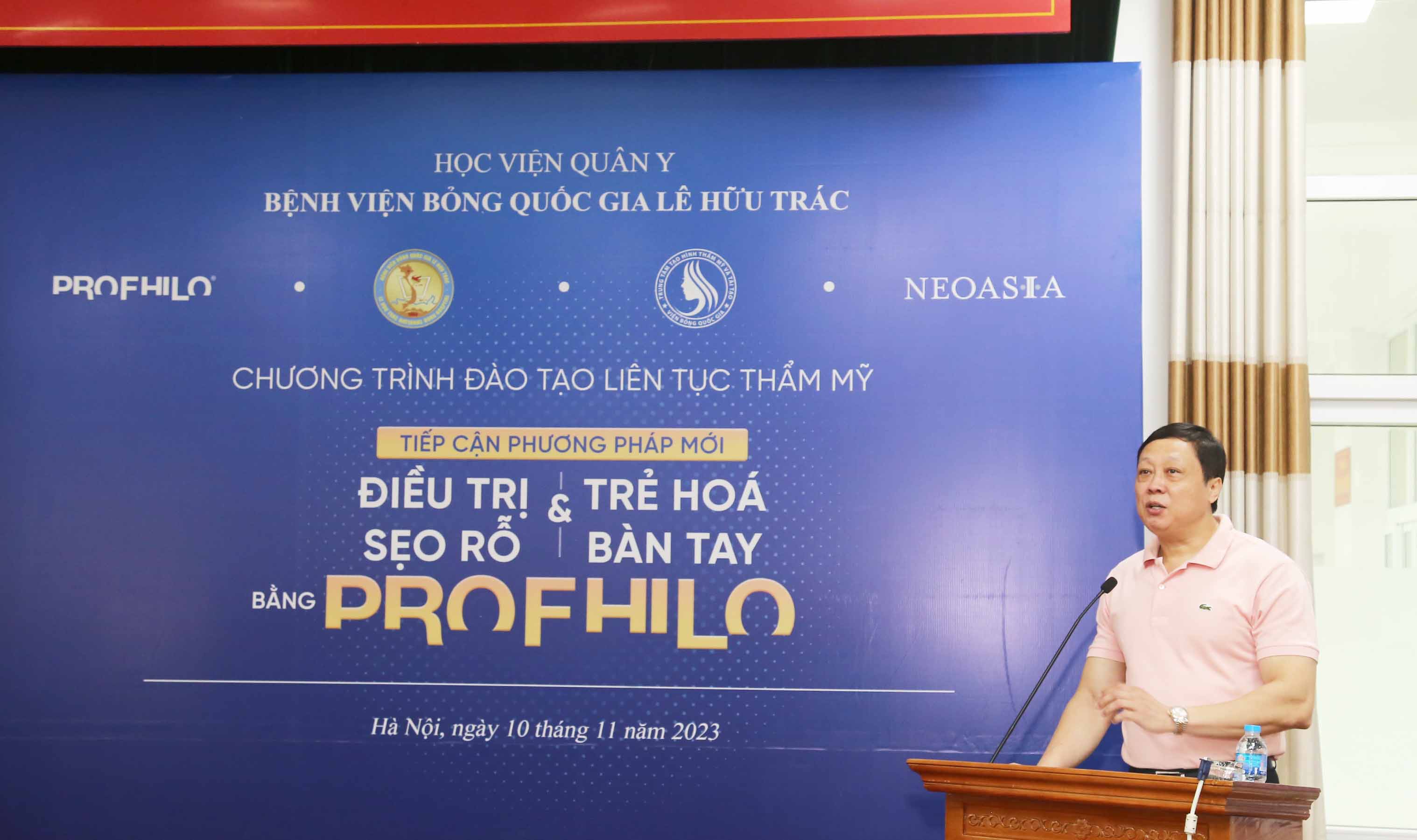Sáng ngày 10/11/2023, Bệnh viện Bỏng Quốc gia Lê Hữu Trác/Học viện Quân y tổ chức lớp đào tạo liên tục Điều trị sẹo rỗ mặt và trẻ hoá bàn tay bằng Profhilo cho 150 học viên là các bác sĩ đang công tác ở nhiều bệnh viện trong khu vực Hà Nội.