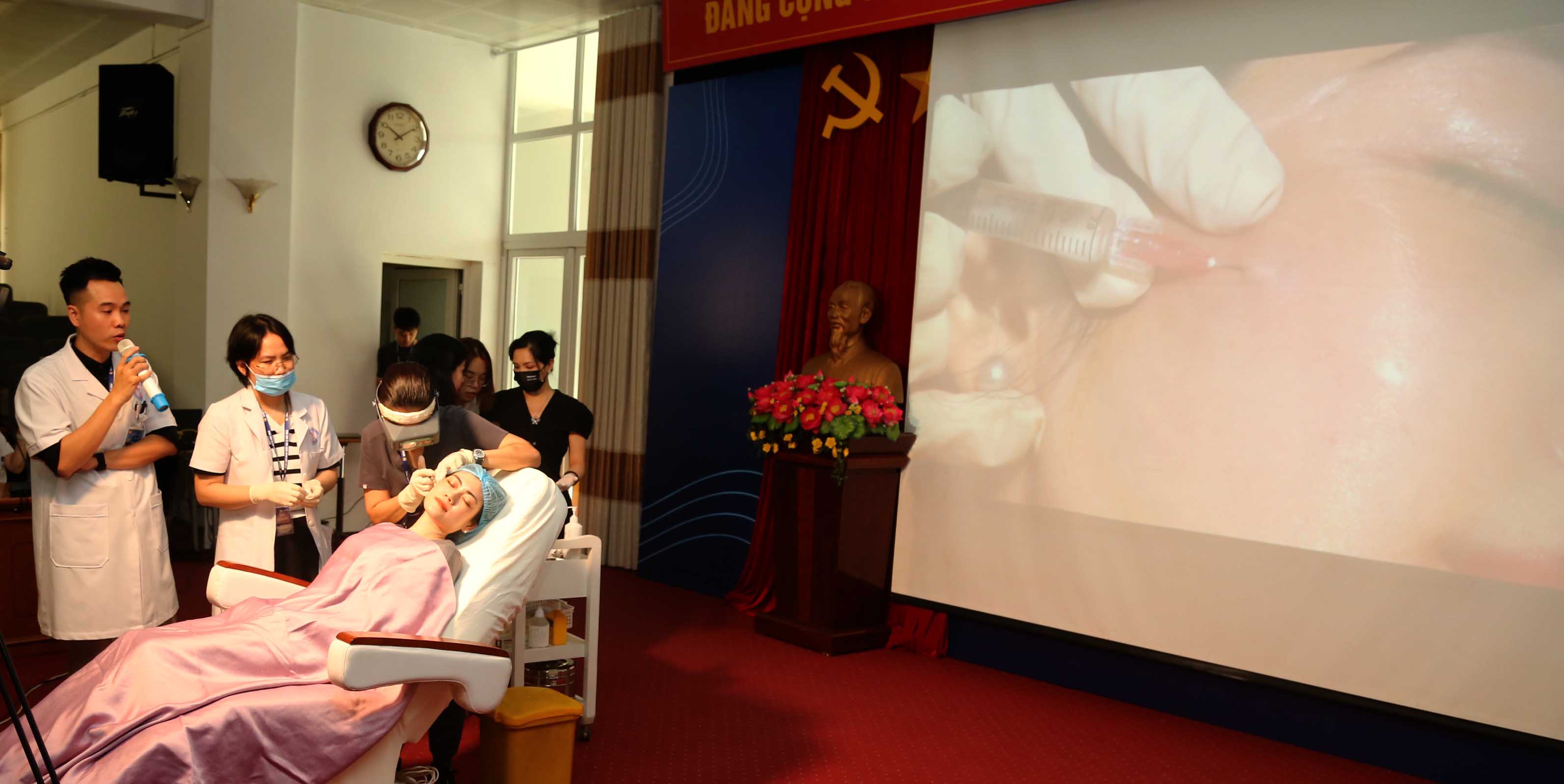 Tại buổi tập huấn bác sĩ Allen Cabrera trình bầy lý thuyết về kỹ thuật tiêm vùng mặt, cổ, bàn tay: Từ cơ bản (5 điểm), đến nâng cao (tiêm cannula); Ứng dụng profhilo tiêm tách đáy trị sẹo rỗ; Quy trình kết hợp: EBD x Profhilo; Chỉ x Profhilo.