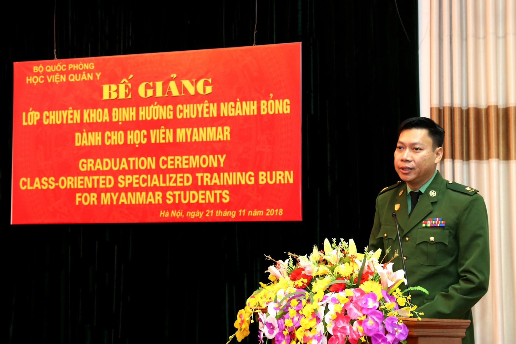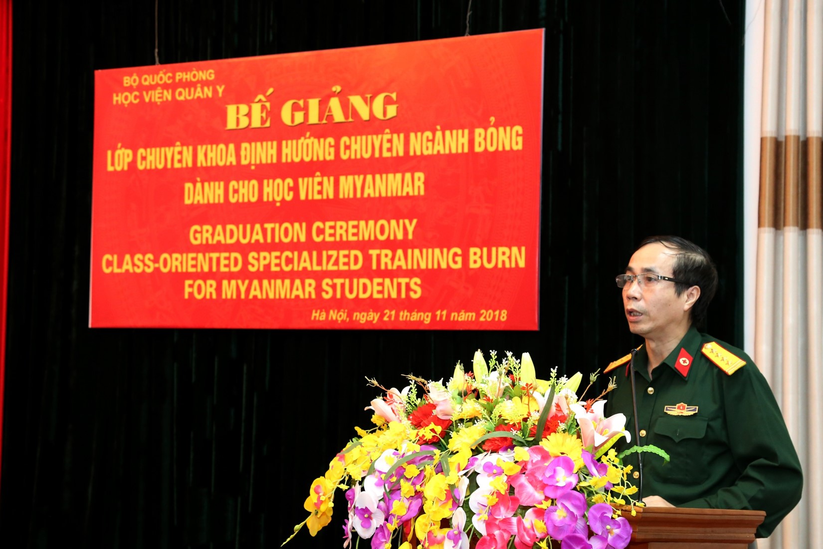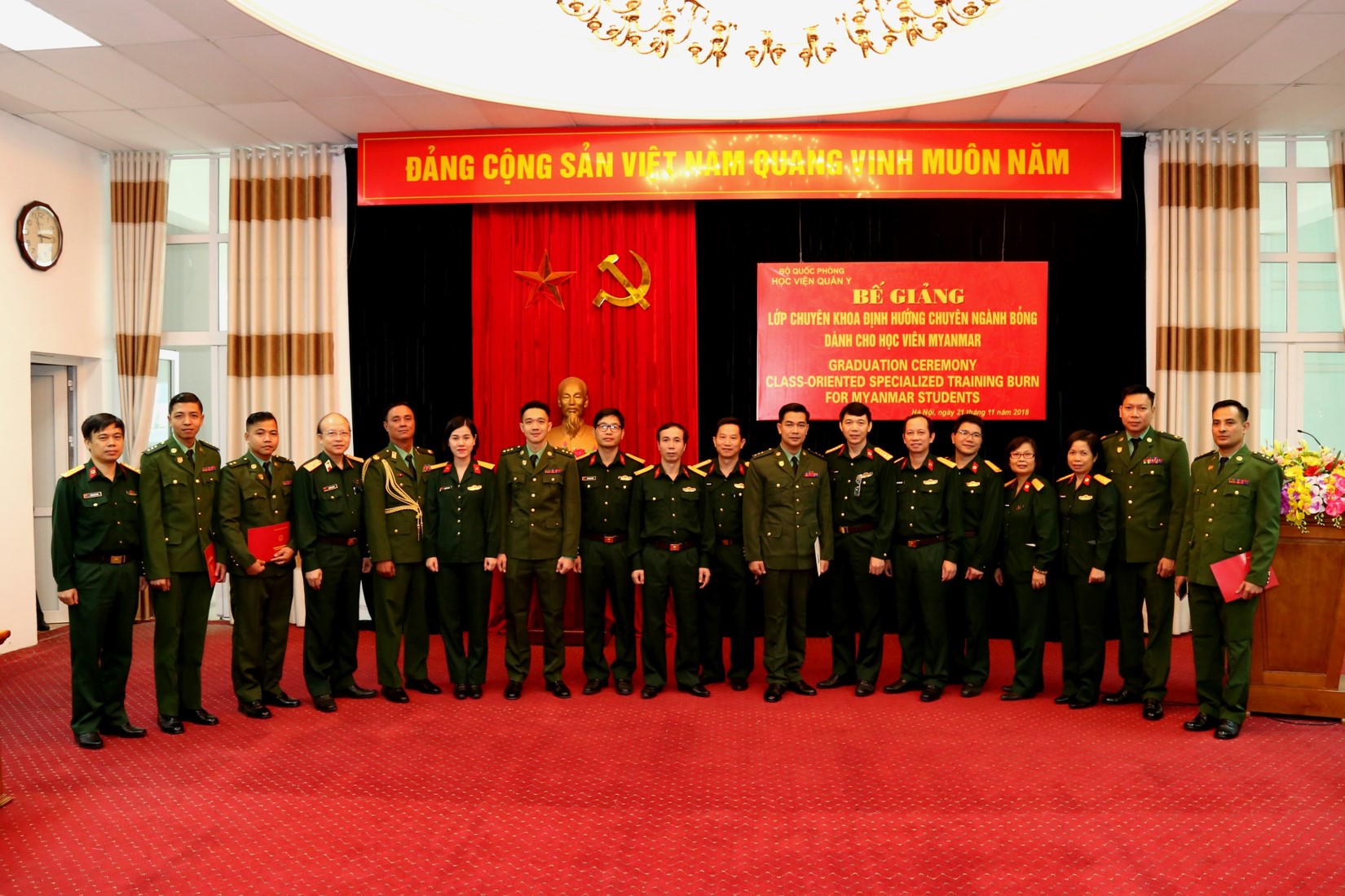 BVBQG: Thực hiện chương trình hợp tác giữa quân đội hai nước Việt Nam – Myanmar, được sự nhất trí của Thủ trưởng Bộ Quốc phòng và các cơ quan chức năng, lớp chuyên khoa định hướng chuyên ngành Bỏng cho học viên Myanmar đã được thành lập, sau sáu tháng triển khai dạy và học, chương trình đào tạo đã hoàn thành tốt đẹp. Ngày 21/11/2018, Học viện Quân y đã tổ chức Bế giảng lớp chuyên khoa định hướng chuyên ngành Bỏng cho các học viên Myanmar.