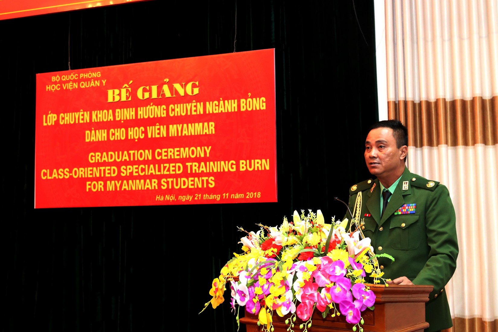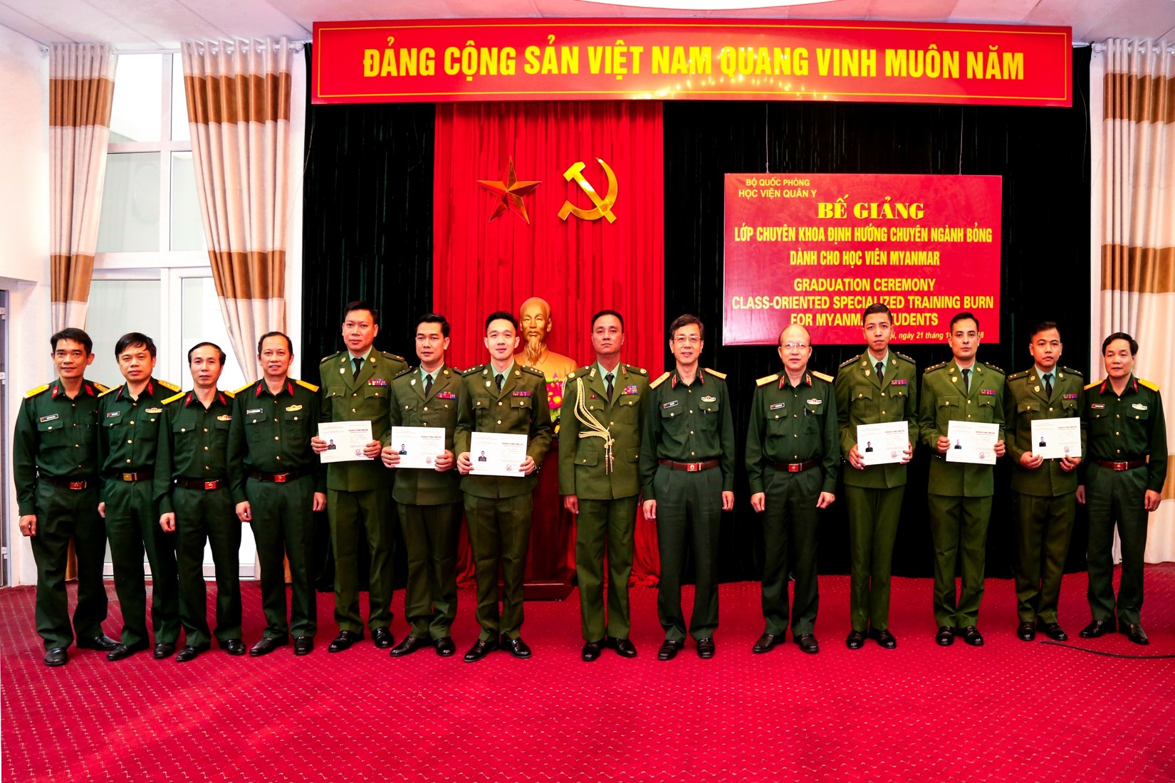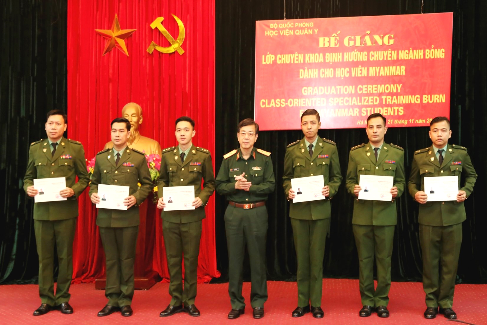 BVBQG: Thực hiện chương trình hợp tác giữa quân đội hai nước Việt Nam – Myanmar, được sự nhất trí của Thủ trưởng Bộ Quốc phòng và các cơ quan chức năng, lớp chuyên khoa định hướng chuyên ngành Bỏng cho học viên Myanmar đã được thành lập, sau sáu tháng triển khai dạy và học, chương trình đào tạo đã hoàn thành tốt đẹp. Ngày 21/11/2018, Học viện Quân y đã tổ chức Bế giảng lớp chuyên khoa định hướng chuyên ngành Bỏng cho các học viên Myanmar.