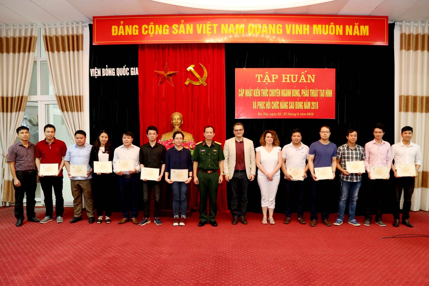 VBQG: Sau 80 tiết học lý thuyết trong thời gian 04 ngày ( từ 23/4 đến 27/4/2018) và thăm quan thực hành tại các khoa lâm sàng tại Viện Bỏng, ngày 27/4/2018, Lớp tập huấn: "Cập nhật kiến thức chuyên ngành Bỏng, Phẫu thuật tạo hình và phục hồi chức năng sau bỏng" đã bế giảng.