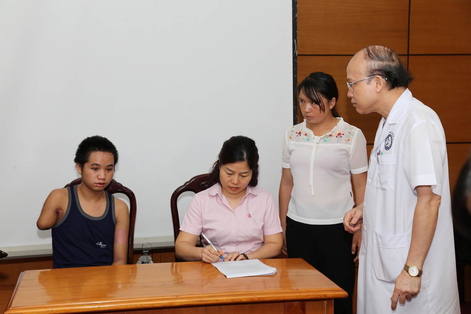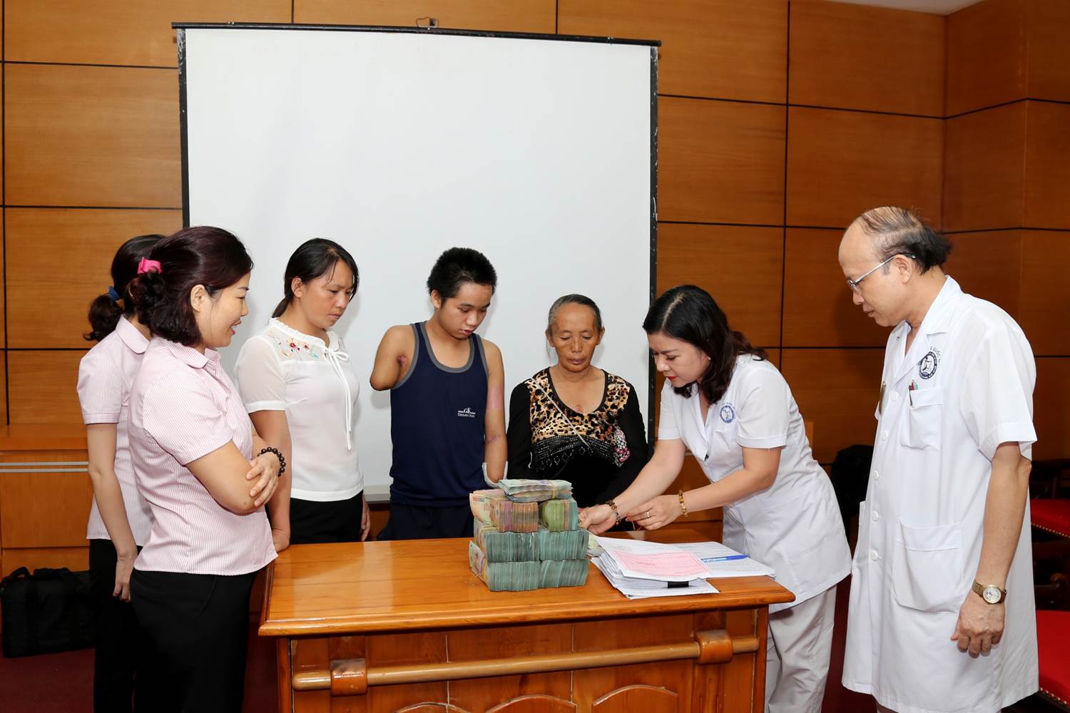 BVBQG - Ngày 24/8/2018, tại Bệnh viện Bỏng Quốc gia đã làm biên bản bàn giao số tiền của các cơ quan, tổ chức và cá nhân có tấm lòng từ thiện gửi tặng cho em Thào A Pao, người Mông (17 tuổi) bản Sì Phài, xã Dào San, huyện Phong Thổ, Lai Châu bị bỏng điện tay phải của em đã bị đứt lìa, tay trái hoại tử phải cắt bỏ, chân và nhiều vị trí khác cũng bị bỏng nặng. Ngày 24/8/2018, cháu được ra viện.