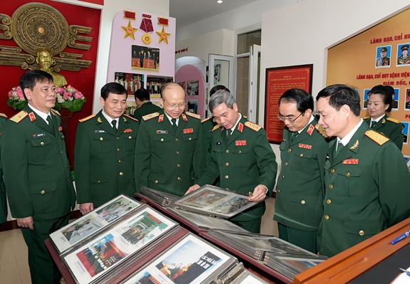 Thượng tướng Đỗ Căn cùng các đại biểu tham quan Phòng Truyền thống của bệnh viện.