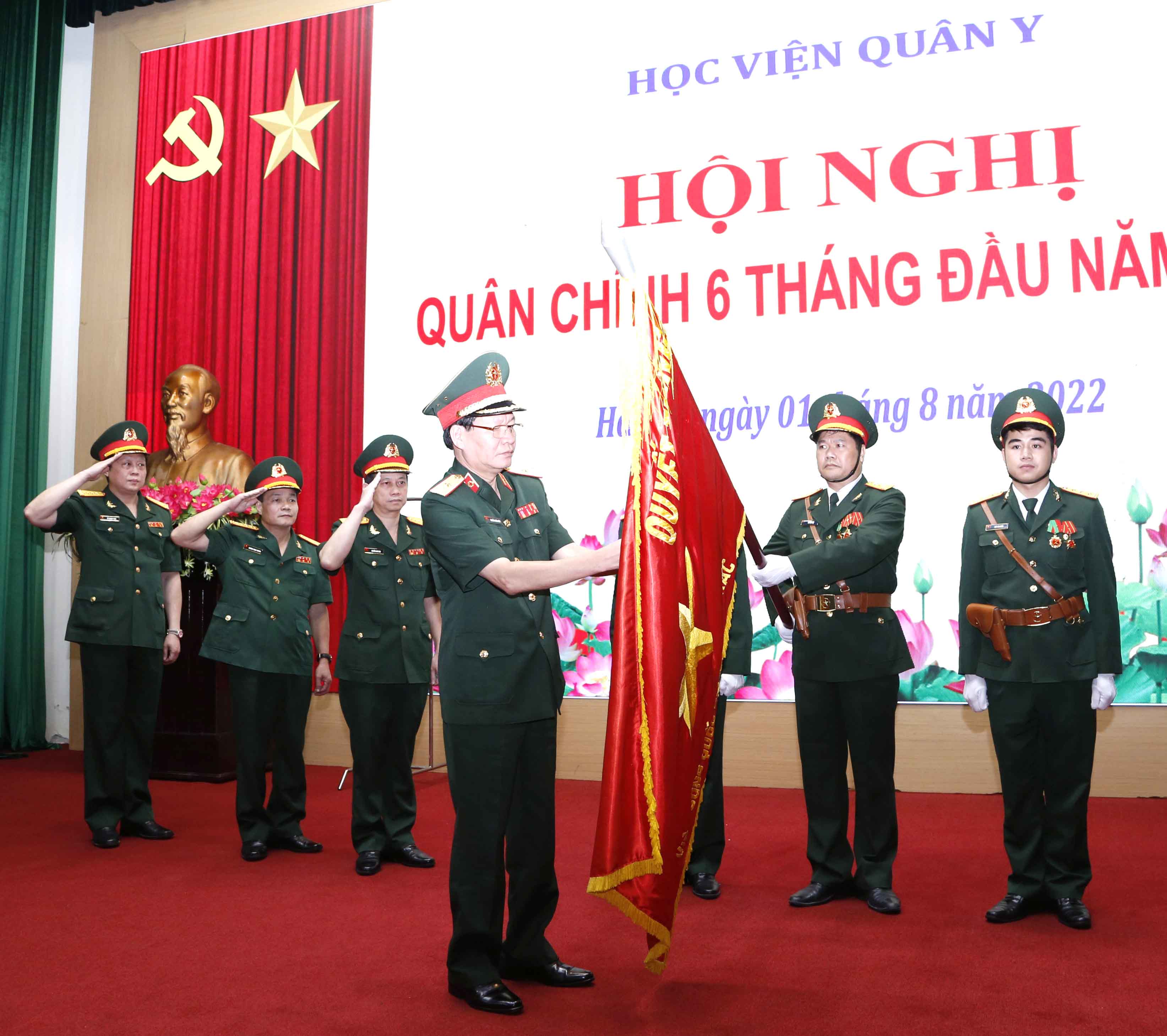 Thừa uỷ Quyền của Chủ tịch nước, Thiếu tướng, PGS.TS. Nguyễn Xuân Kiên, Giám đốc Học viện Quân y gắn Huân chương Lao Động hạng Ba lên Quân kỳ Quyết thắng của Bệnh viện