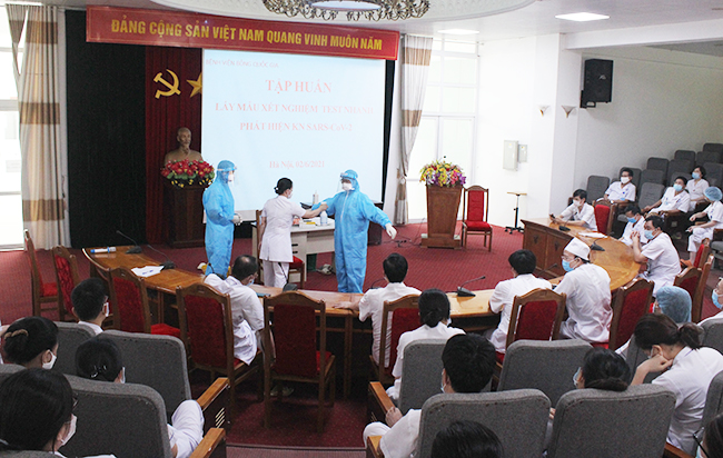 Tại buổi tập huấn, các bác sỹ, điều dưỡng được ThS.BS. Trương Thị Thu Hiền - Phó Chủ Nhiệm Khoa Cận Lâm sàng Bệnh viện đã hướng dẫn các nội dung sau: Sử dụng bộ bảo hộ (PPE) trong phòng, chống dịch cho nhân viên y tế tham gia lấy mẫu xét nghiệm virus SARS-CoV-2; Hướng dẫn lấy mẫu, bảo quản, vận chuyển bệnh phẩm, Hướng dẫn lấy mẫu gộp theo quy trình của Bộ Y tế đã được quy định, Hướng dẫn sử dụng bộ Kit chẩn đoán xét nghiệm test nhanh kháng nguyên virus SARS-CoV-2.