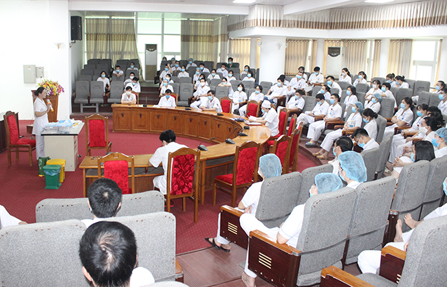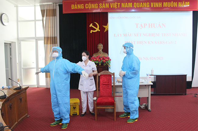 Nhằm giúp các bác sĩ, điều dưỡng thực hiện thành thạo, đúng quy trình lấy mẫu và triển khai làm xét nghiệm SARS-CoV-2 bằng test nhanh, đồng thời sẵn sàng đáp ứng được các yêu cầu lên đường tham gia phòng chống dịch khi có mệnh lệnh, ngày 2/6 - Bệnh viện Bỏng Quốc gia Lê Hữu Trác tổ chức tập huấn lấy mẫu, xét nghiệm vi rus SARS-CoV-2 bằng test nhanh cho bác sỹ, điều dưỡng toàn Bệnh viện.