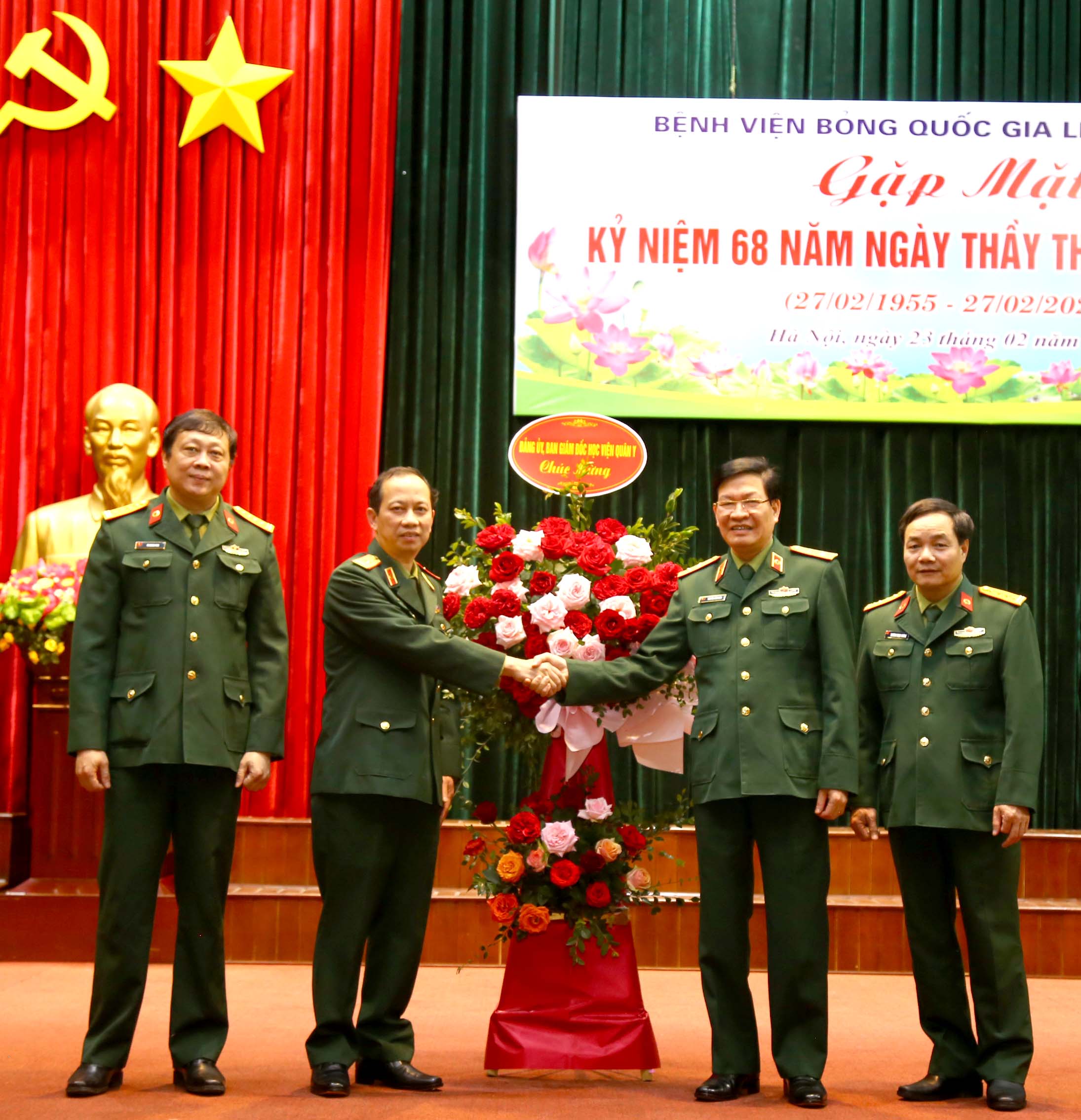 Thay mặt Đảng uỷ, Ban Giám đốc Học viện, Trung tướng, PGS, TS. Nguyễn Xuân Kiên, Giám đốc Học viện Quân y (đứng thứ 2 bên phải) tặng hoa chúc mừng ngày 27/2 Bệnh viện
