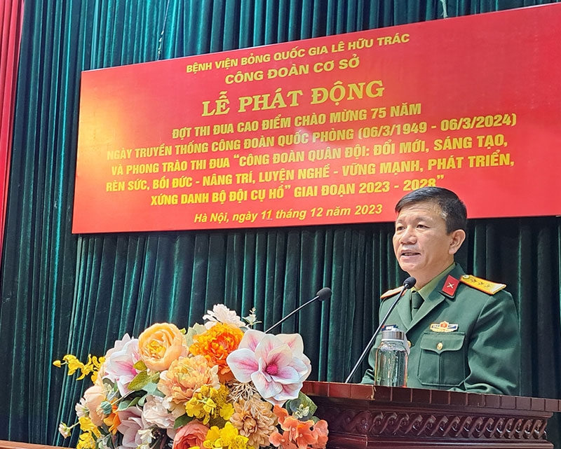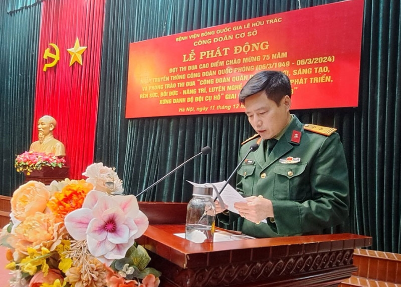 Chiều 11/12/2023, Công đoàn cơ sở Bệnh viện Bỏng Quốc gia Lê Hữu Trác tổ chức Lễ phát động Phong trào thi đua chào mừng 75 năm ngày truyền thống công đoàn Quốc phòng (06/3/1949-06/3/2024) và phong trào thi đua công đoàn Quân đội: Đổi mới, sáng tạo - Rèn sức, bồi đức - Nâng trí, luyện nghề - Vững mạnh, phát triển, xứng danh Bộ đội Cụ Hồ” giai đoạn 2023 - 2028 với chủ đề “75 ngày hành động kiểu mẫu”, thời gian thi đua từ ngày 23/12/2023 đến 06/3/2024.