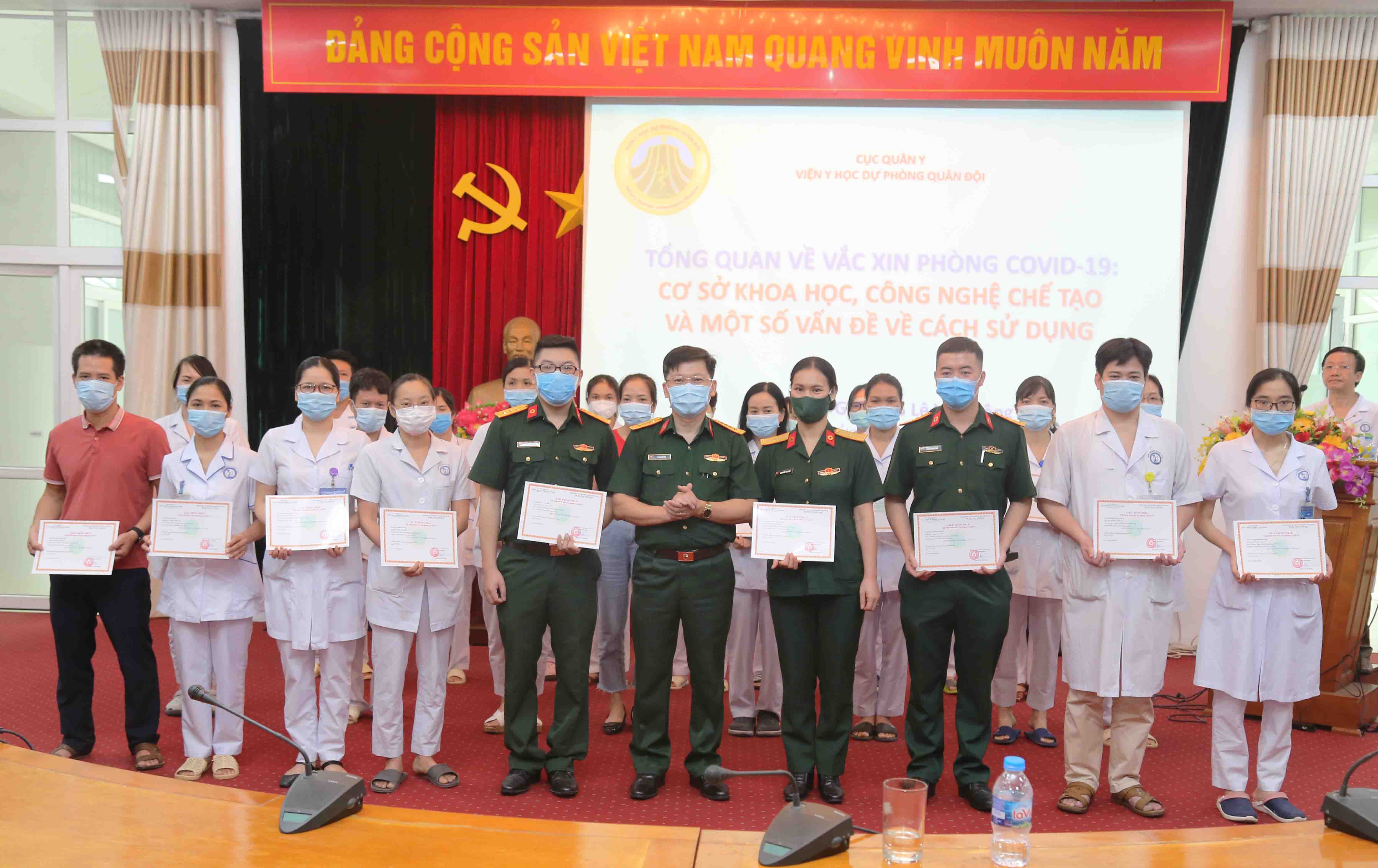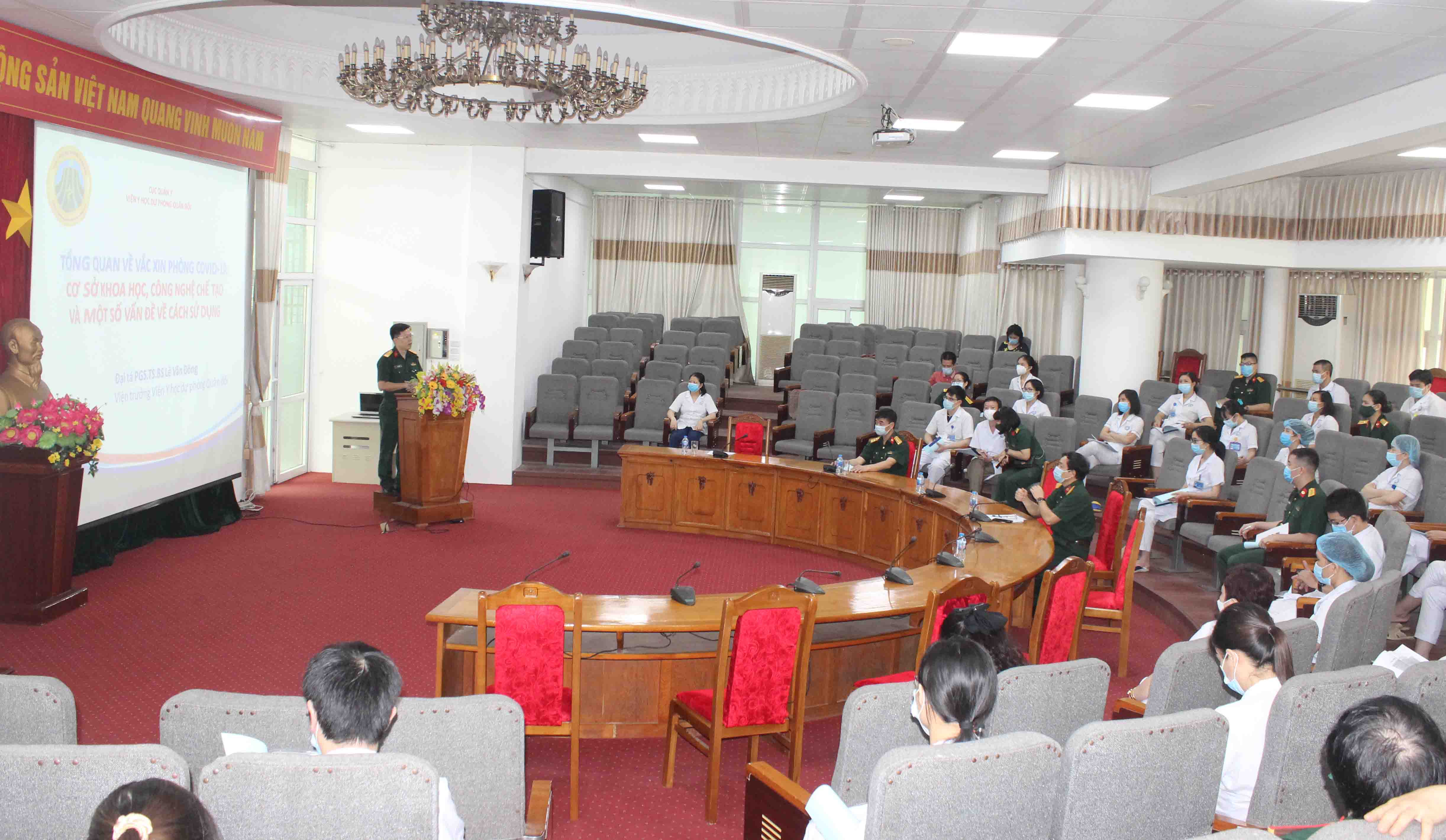Với mục tiêu cập nhật kiến thức và rèn luyện kỹ năng thực hành cho nhân viên y tế, đảm bảo đầy đủ điều kiện tổ chức tiêm chủng, đặc biệt an toàn trong tiêm vắc xin phòng Covid-19. PGS.TS. Lê Văn Đông, Giám đốc Viện YHDP Quân đội đã giới thiệu các thông tin cơ bản về vắc xin Covid-19 đã được Bộ Y tế cấp phép sử dụng của AstraZeneca, Comirnaty của Pfizer, Moderna và Vero Cell (Sinopharm) về liều lượng, đường tiêm, chỉ định, chống chỉ định, cách bảo quản và sử dụng vắc xin, sau đó là công tác giám sát phản ứng sau tiêm chủng, đối tượng tiêm chủng, phòng, chẩn đoán và xử trí khi xẩy ra sốc phản vệ...