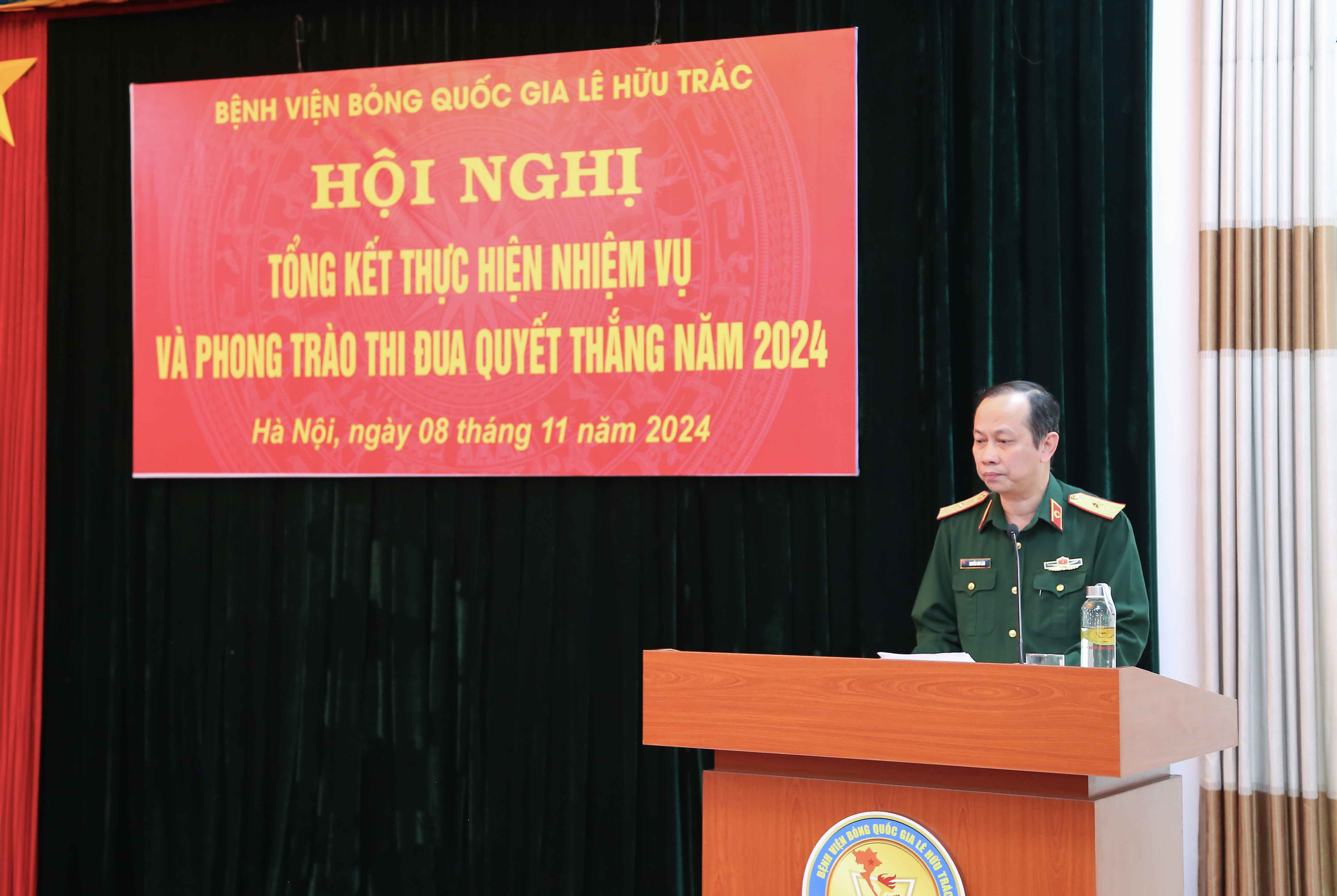 Thay mặt Hội đồng Thi đua Khen thưởng, Thiếu tướng GS. TS. Nguyễn Như Lâm, Giám đốc Bệnh viện, Phó chủ tịch Hội đồng Thi đua Khen thưởng Bệnh viện đã báo cáo Tổng kết thực hiện nhiệm vụ và Phong trào TĐQT năm 2024. Phong trào TĐQT năm 2024 của Bệnh viện diễn ra liên tục và sôi nổi, là động lực thúc đẩy mạnh mẽ sự phấn đấu, sáng tạo của mỗi tập thể và cá nhân. Các chỉ tiêu bệnh viện đề ra đều hoàn thành tốt, có nhiều nội dung hoàn thành xuất sắc. Bệnh viện đã có bước phát triển tích cực, nhất là về chuyên môn kỹ thuật chuyên ngành bỏng, liền vết thương và phẫu thuật tạo hình thẩm mỹ. Nhiều ca bỏng nguy hiểm, bỏng hàng loạt với các bệnh nhân có độ bỏng sâu, diện tích rộng đều được cấp cứu, điều trị thành công. Nâng cao toàn diện chất lượng khám điều trị với tinh thần lấy người bệnh làm trung tâm; duy trì thực hiện nghiêm 44 chế độ bệnh viện và 83 tiêu chí của Bộ Y tế.