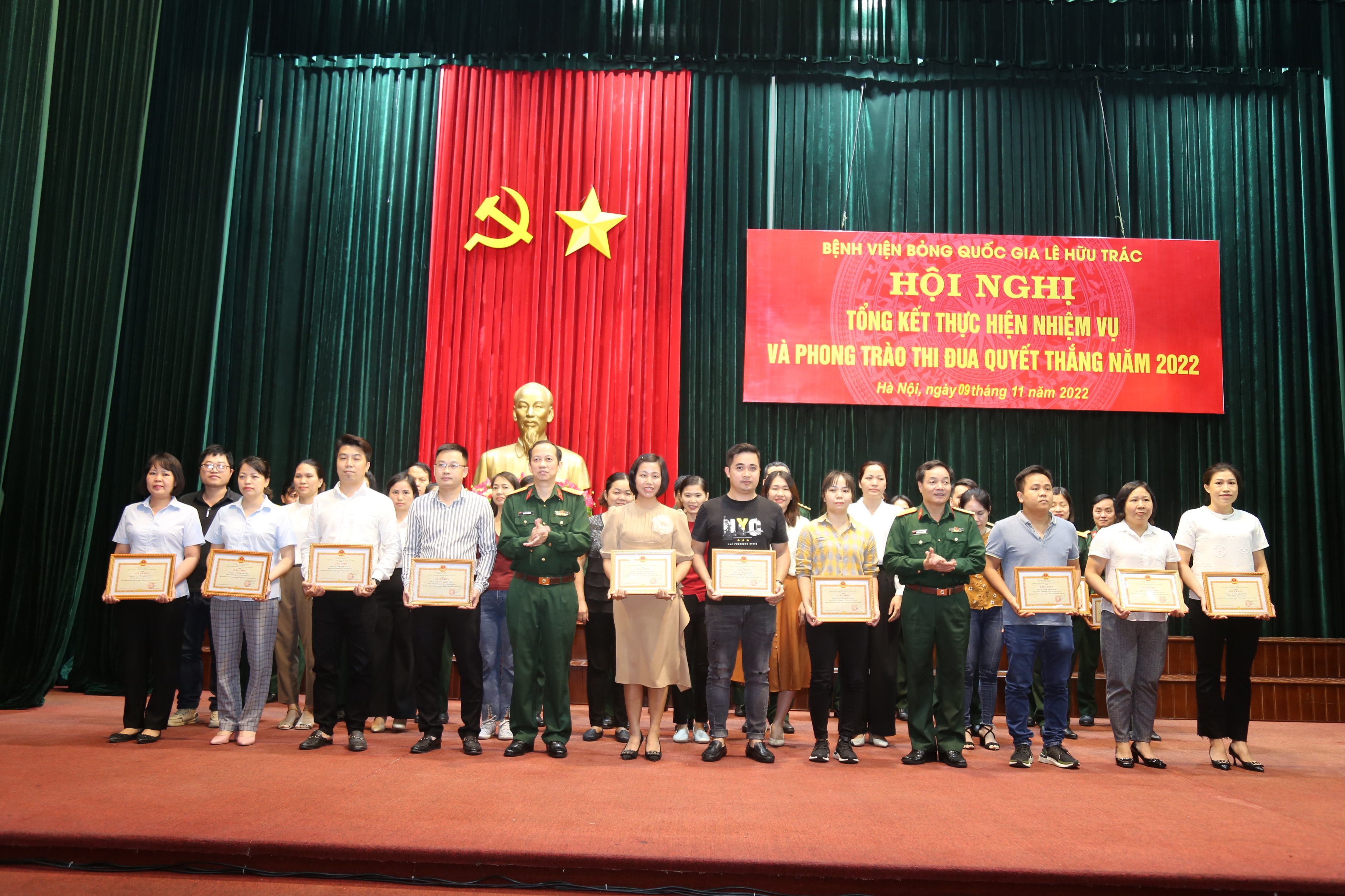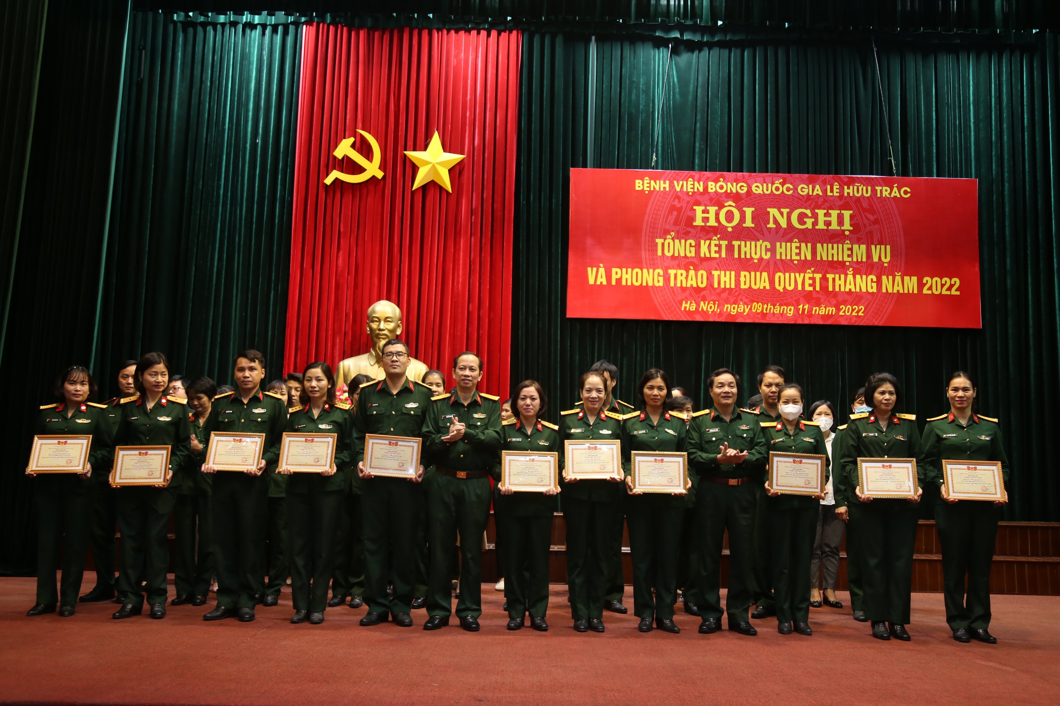 Với những kết quả đã đạt được trong phong trào thi đua quyết thắng năm 2022, Bệnh viện được đề nghị tặng "Cờ thi đua của Thủ tướng Chính phủ" vì đã hoàn thành xuất sắc nhiệm vụ năm 2022, có 11 tập thể và 129 cá nhân được khen thưởng ở các hình thức trong đó: danh hiệu "Đơn vị Quyết thắng" cho 04 tập thể; danh hiệu "Đơn vị Tiên tiến" cho 06 tập thể; danh hiệu "Chiến sỹ thi đua" cho 24 cá nhân và danh hiệu "Chiến sĩ Tiến tiến" cho 31 cá nhân. Bệnh viện Bỏng Quốc gia Lê Hữu Trác trao tặng danh hiệu "Đơn vị Tiên tiến" cho 01 tập thể và danh hiệu "Chiến sĩ Tiến tiến" cho 62 các nhân; tặng giấy khen cho 36 đồng chí lao động hợp đồng.