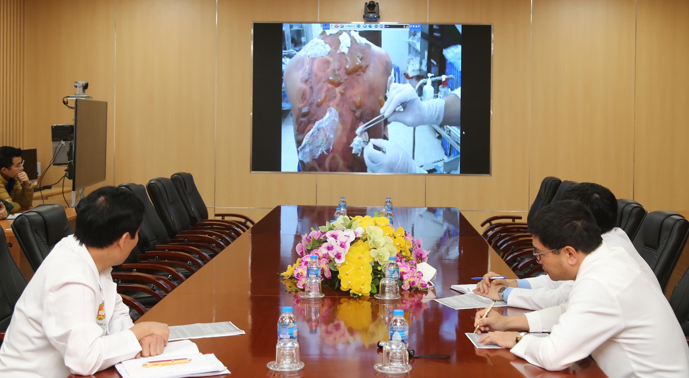 TS.BS. Đỗ Lương Tuấn, CNK Bỏng Người lớn (bên phải hàng đầu) khám, hướng dẫn điều trị xử lý vết thương trực tuyến từ xa