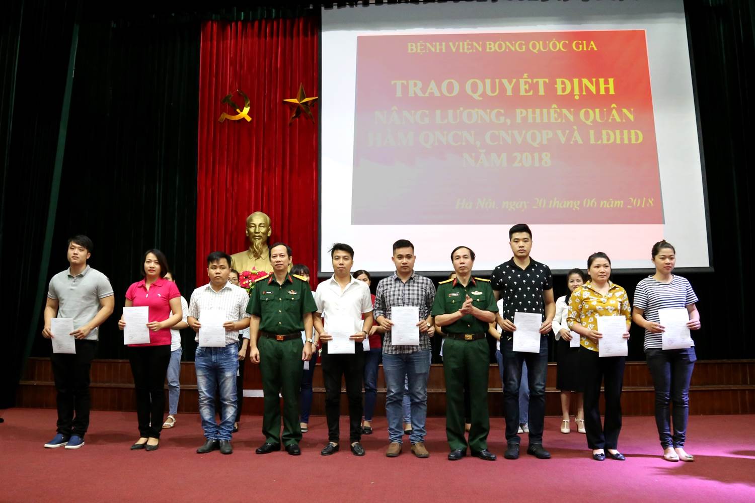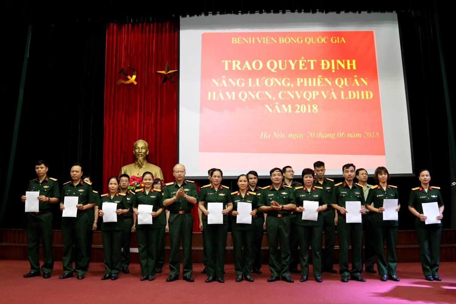 Thiếu tướng Nguyễn Gia Tiến, Giám đốc Bệnh viện và Đại tá Trương Ngọc Dương, Chính ủy Bệnh viện trao quyết định cho các đồng chí được nâng lương thường xuyên