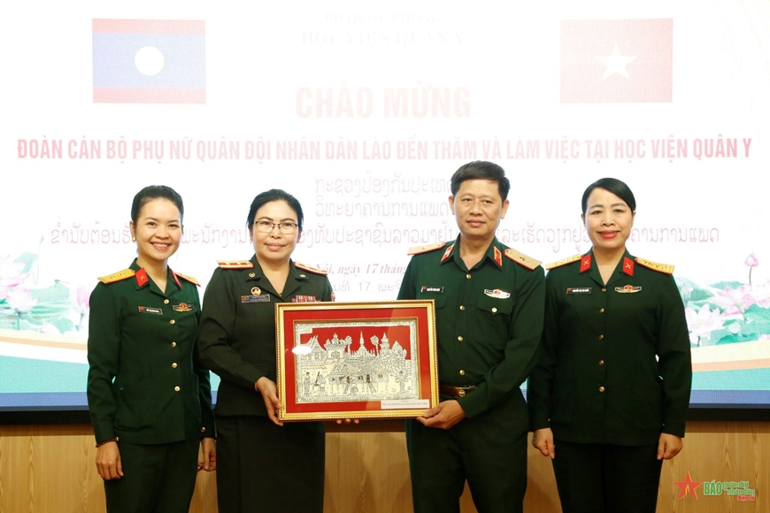 Đoàn cán bộ phụ nữ Quân đội nhân dân Lào trao quà lưu niệm tặng Học viện Quân y.