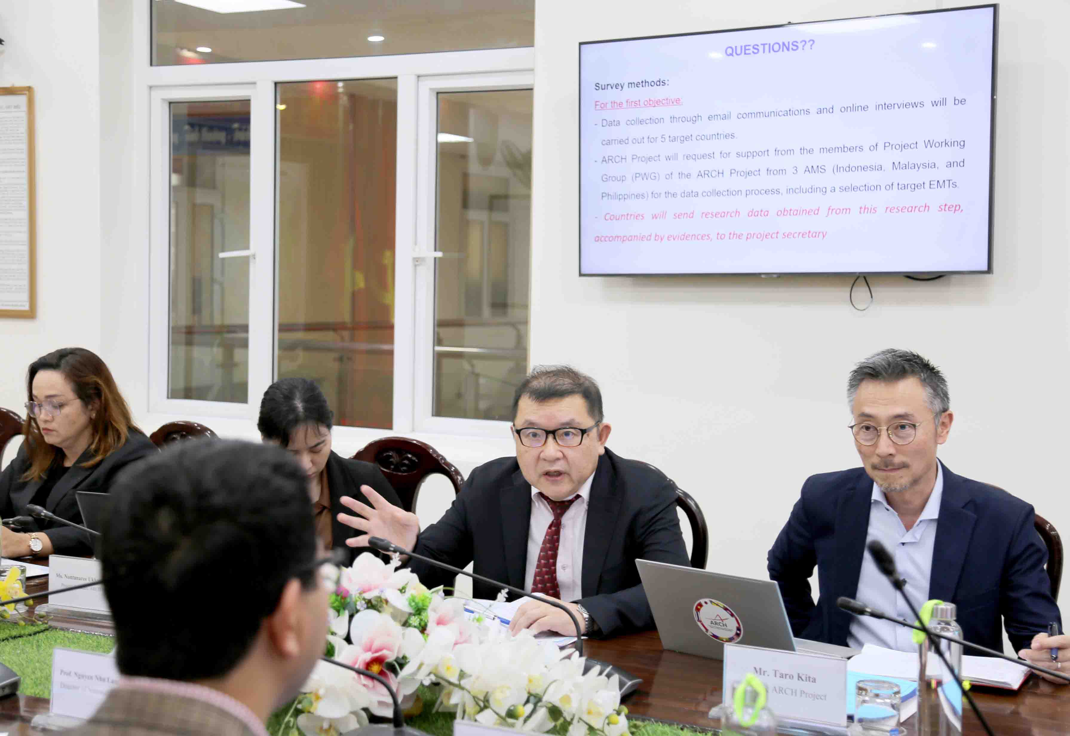 + Thứ nhất là triển khai nhiệm vụ khoa học “Đánh giá thực trạng cơ số thuốc, các trang thiết bị y tế và kiến thức về đáp y tế trong thảm họa của các Đội EMT tại các nước ASEAN”. Đề xuất và đại diện cho Bộ Y tế thực hiện nhiệm vụ này, đại diện nhóm nghiên cứu của Bệnh viện Bỏng quốc gia Lê Hữu Trác đã trình bày nội dung, kế hoạch triển khai nghiên cứu tại 5 quốc gia thành viên khối ASEAN (Indonesia, Malaysia, Philippines, Thailand và Việt Nam). Kế hoạch triển khai nghiên cứu đã nhận được sự đồng thuận cao của các chuyên gia dự án ARCH, Viện NIEM (đơn vị đồng thực hiện), các chuyên gia của Bộ Y tế, Bệnh viện Hữu nghị Việt Đức và Bộ môn Y học cấp cứu Ngoại viện, Đại học Y dược, Đại học Quốc gia Hà Nội.