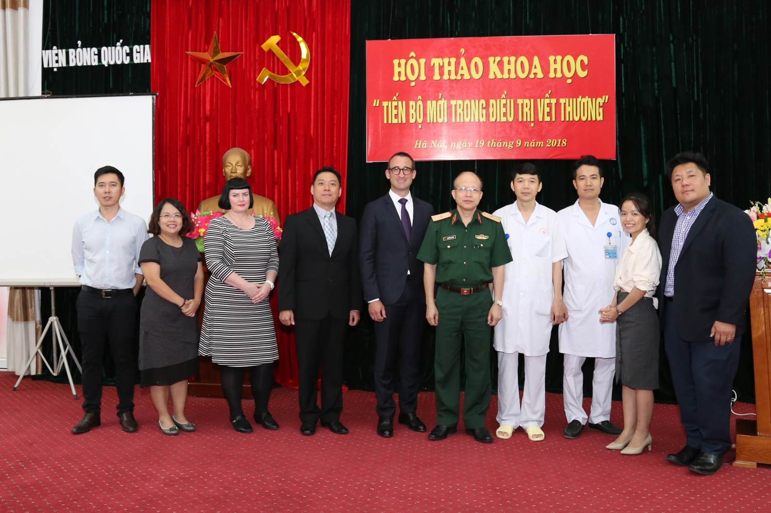 BVBQG: Được sự đồng ý của cơ quan các cấp, chiều ngày 19/9/2018, Bệnh viện Bỏng Quốc gia đã tổ chức Hội thảo khoa học: "Tiến bộ mới trong điều trị vết thương", cùng với bốn chuyên gia từ Malaysia, Anh quốc, Đức và Singapore đến để trao đổi kinh nghiệm trong chăm sóc vết thương.