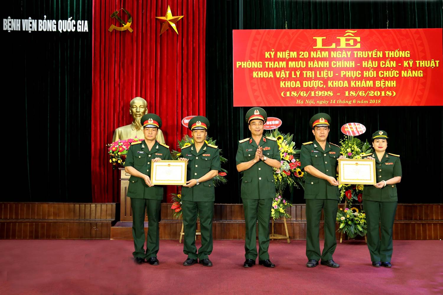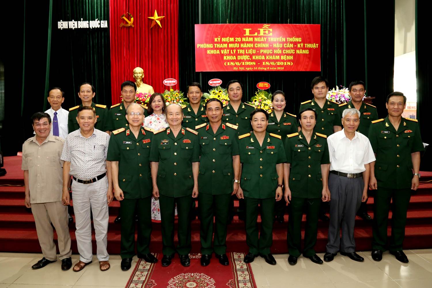 Phát biểu chào mừng Lễ kỷ niệm,Thiếu tướng, PGS.TS. Nguyễn Gia Tiến, Giám đốc Viện Bỏng Quốc gia đã biểu dương, khen ngợi sự nỗ lực phấn đấu, những kết quả, thành tích của 4 khoa, phòng: Phòng Tham mưu hành chính - Hậu cần - Kỹ thuật, Khoa Vật lý trị liệu - Phục hồi chức năng, Khoa Dược - Trang bị, Phòng Khám bệnh đã giành được trong suốt 20 năm qua, đặc biệt Phòng Tham mưu hành chính - Hậu cần - Kỹ thuật, Khoa Vật lý trị liệu - Phục hồi chức năng đã được Bộ trưởng Bộ quốc phòng trao tặng bằng khen. Đồng chí mong rằng, trong thời gian tới, cán bộ, nhân viên 4 khoa, phòng tiếp tục giành được nhiều thành tích to lớn hơn nữa, góp phần vào thành tích của Viện Bỏng, để Bệnh viện thực hiện thắng lợi nhiệm vụ chính trị trung tâm, xứng đáng với niềm tin yêu của Đảng, Nhà nước và Nhân dân.