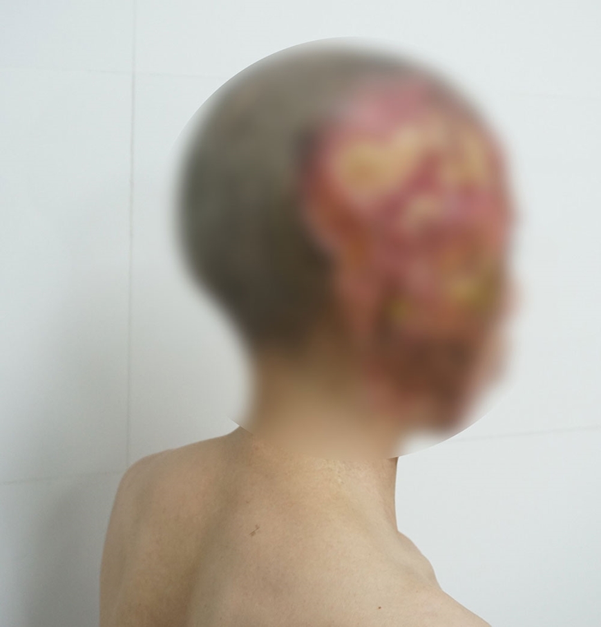 Bệnh nhân này bị ngã úp mặt trong chậu than nóng nhiều giờ do ngộ độc khí CO2 khi đốt than sưởi ấm trong nhà, bị tổn thương rất rộng vùng đầu mặt, lộ xương sọ vùng thái dương đỉnh phải và xương gò má bên phải, các mạch máu cũng bị nhiệt phá hủy nguy cơ hoại tử toàn bộ xương nửa sọ và mặt bên phải nếu không được che phủ sớm.