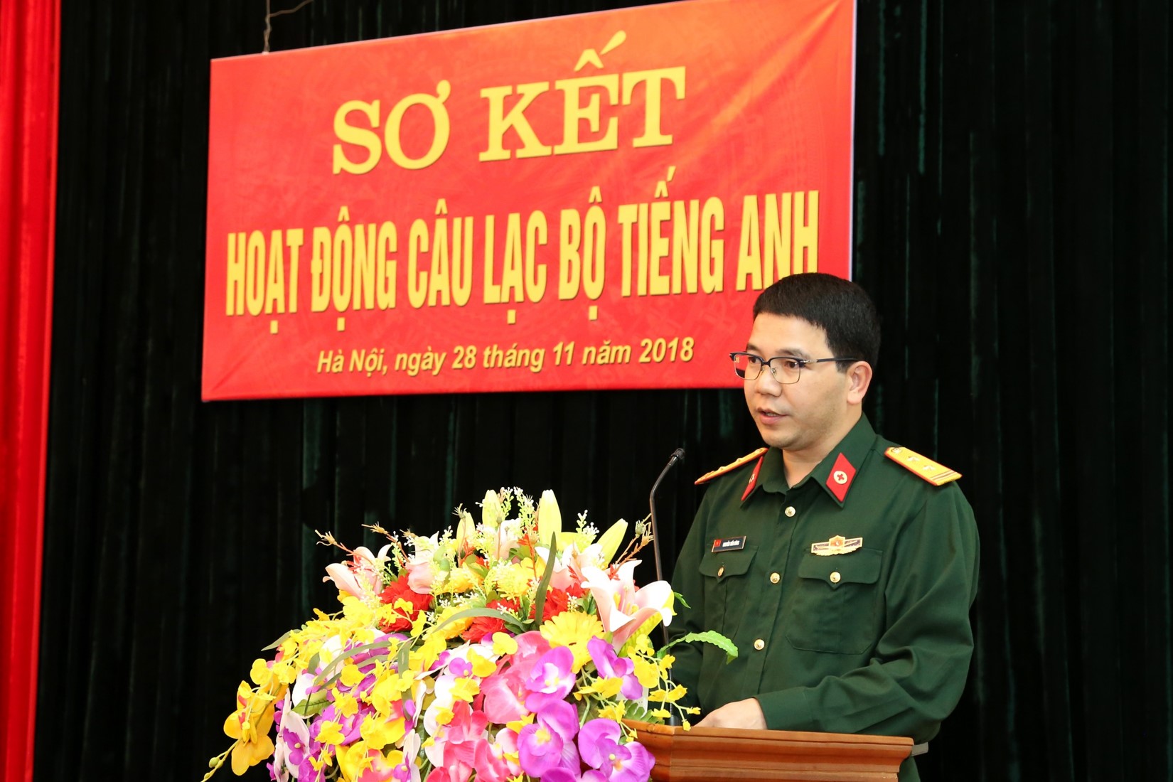 Tại buổi sơ kết, Trung tá Nguyễn Tiến Dũng, Chủ nhiệm Câu lạc bộ đã đọc báo cáo sơ kết hoạt động của Câu lạc bộ trong năm qua. Trong năm 2018, Câu lạc bộ đã tổ chức báo cáo các công trình nghiên cứu khoa học bằng tiếng Anh; Thuyết trình tiếng Anh giao tiếp dưới mọi hình thức; Và duy trì được báo cáo thông qua mổ bằng tiếng Anh. Ngoài ra, Câu lạc bộ cũng đã giúp Bộ môn Bỏng và Y học thảm họa dịch giáo trình bỏng để giảng dạy cho các học viên Myanma. Tham gia dịch bài giảng của các chuyên gia khi tham gia giảng bài và trao đổi chuyên môn tại Bệnh viện…Trong báo cáo, đồng chí cũng đã đề xuất với lãnh đạo bệnh viện được duy trì thông qua mổ bằng tiếng Anh với mục đích nâng cao trình độ tiếng Anh chuyên ngành và khả năng phản biện, tranh luận bằng tiếng Anh.