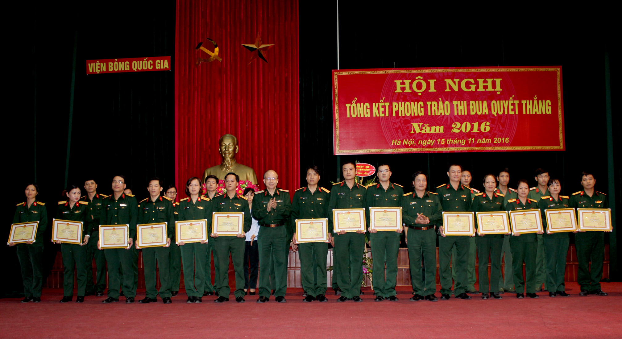 Thay mặt Đảng ủy - Ban giám đốc Viện Bỏng Quốc gia Thiếu tướng, PGS.TS Nguyễn Gia Tiến, Giám đốc Viện Bỏng Quốc gia đã đọc báo cáo tổng kết phong trào thi đua quyết thắng năm 2016. Trong báo cáo, đồng chí đã tổng kết các mặt đã đạt được trong năm 2016, đồng thời chỉ ra những điểm còn tồn tại, qua đó đề ra biện pháp khắc phục trong năm tới. Trong năm 2016, Viện đã Thường xuyên nâng cao chất lượng điều trị, chú trọng áp dụng các kỹ thuật mới hiện đại và hiệu quả được duy trì áp dụng như: Kỹ thuật nội soi chẩn đoán và điều trị bỏng hô hấp; Kỹ thuật cắt bỏ hoại tử bỏng sớm, che phủ sớm vết thương bằng các vật liệu thay thế da (trung bì da lợn, da đồng loại); Kỹ thuật siêu lọc máu liên tục để điều trị bệnh nhân nhiễm trùng, nhiễm độc bỏng cấp, suy đa tạng ở bệnh nhân bỏng nặng, đặc biệt kỹ thuật thở máy dài ngày; Kỹ thuật thông khí mở phổi điều trị hội chứng ARDS trong bỏng nặng có biến chứng hô hấp và bỏng hô hấp. Các kỹ thuật điều trị phục hồi chức năng được triển khai áp dụng sớm và hiệu quả, phối hợp chặt chẽ với các chuyên gia Australia, Hồng Kông trong chuyển giao kỹ thuật đã mang lại kết quả tốt (điển hình là kỹ thuật sử dụng quần áo và băng áp lực điều trị, hạn chế sẹo bỏng; sử dụng nẹp Orfit hạn chế sẹo co kéo vùng khớp). Về Phẫu thuật tạo hình và thẩm mỹ di chứng sau bỏng có bước phát triển đáng kể về chất lượng điều trị; nhiểu kỹ thuật được triển khai rộng rãi như: kỹ thuật chuyển vạt da nhánh xuyên, kỹ thuật vi phẫu, kỹ thuật sử dụng vạt da siêu mỏng, vạt da có kích thước lớn bằng vi phẫu điều trị sẹo và biến dạng phức tạp vùng mặt cổ; trong đó kỹ thuật vi phẫu điều trị phù bạch mạch chi trên do di chứng xạ trị ung thư vú, kỹ thuật tái tạo di chứng sẹo co kéo vùng cằm cổ bằng vạt da cân thượng đòn có nối mạch vi phẫu đầu xa là những hướng đi mới, được bạn bè trong nước và quốc tế đánh giá cao; đặc biệt kỹ thuật vi phẫu còn được đẩy cao hơn một bước đó là việc phẫu thuật tái tạo cả khuôn mặt của bệnh nhân bao gồm cả phần da và cấy sụn sườn tạo hình mũi, là hướng phát triển kỹ thuật chuyên sâu cần tiếp tục đẩy mạnh trong những năm tới. Bên cạnh đó, chất lượng điều trị các bệnh nhân có các vết thương lâu liền, vết thương mạn tính cũng đã được nâng cao. Viện Bỏng đã triển khai hiệu quả kỹ thuật hút áp lực âm, kỹ thuật oxy cao áp trong điều trị hỗ trợ vết thương bỏng chậm liền, vết thương mạn tính, ứng dụng các sản phẩm từ công nghệ tế bào vào điều trị đã mang lại kết quả cao... Thay mặt Đảng ủy - Ban Giám đốc, đồng chí kêu gọi toàn thể cán bộ, nhân viên, chiến sỹ hãy nêu cao tinh thần đoàn kết, vượt qua mọi khó khăn, chủ động sáng tạo, tiếp tục đưa phong trào thi đua quyết thắng của Viện lên một tầm cao mới; Thực hiện thắng lợi các chỉ tiêu thi đua, góp phần xây dựng Đảng bộ Viện Bỏng trong sạch vững mạnh, đơn vị vững mạnh toàn diện.