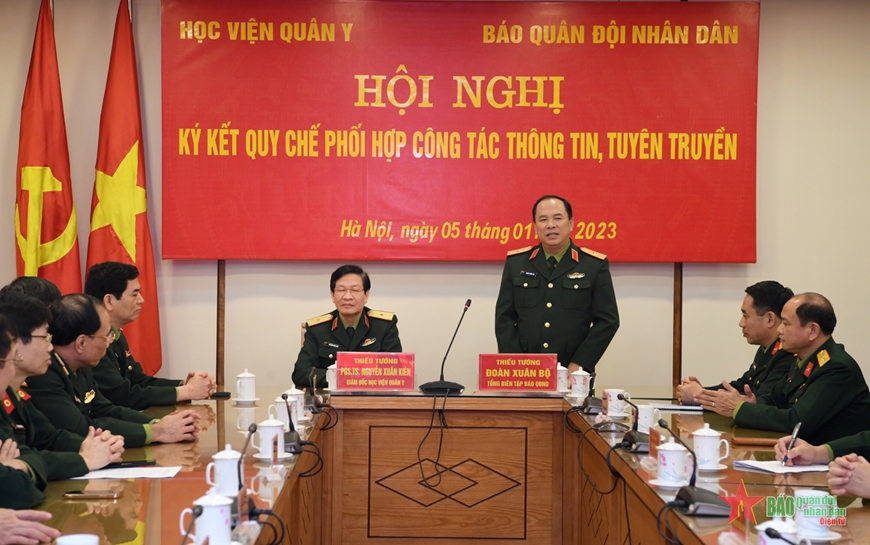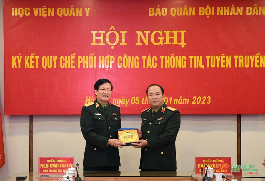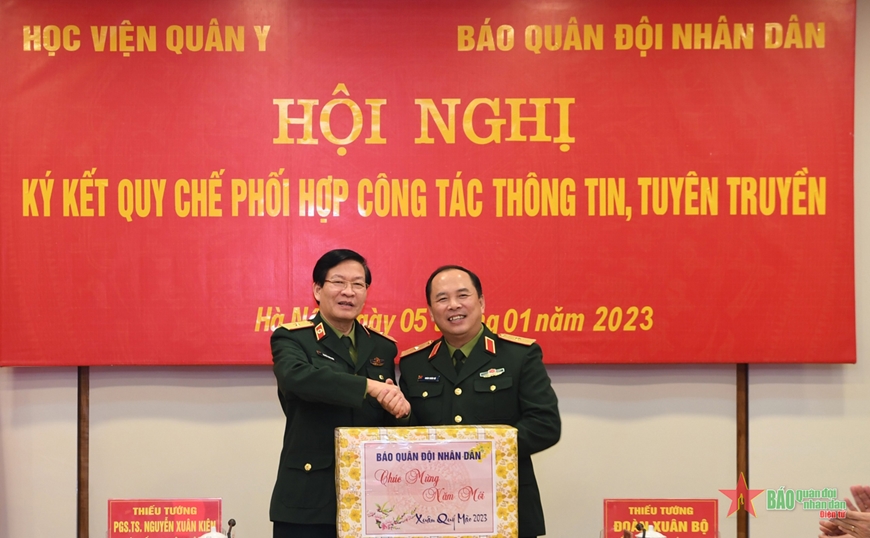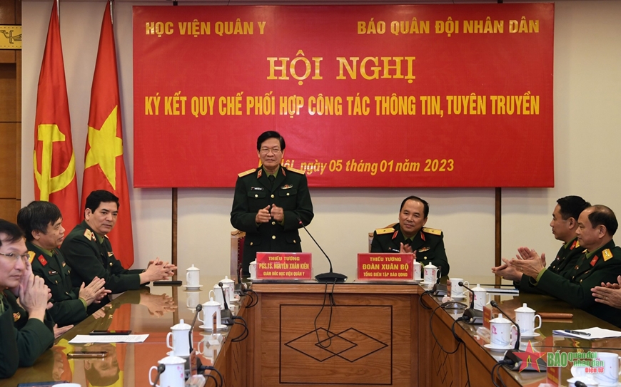 Chiều 5-1, tại Hà Nội, Học viện Quân y và Báo Quân đội nhân dân tổ chức Hội nghị ký kết Quy chế phối hợp công tác thông tin, tuyên truyền năm 2023. Thiếu tướng, PGS, TS Nguyễn Xuân Kiên, Giám đốc Học viện Quân y và Thiếu tướng Đoàn Xuân Bộ, Bí thư Đảng ủy, Tổng biên tập Báo Quân đội nhân dân đồng chủ trì hội nghị.